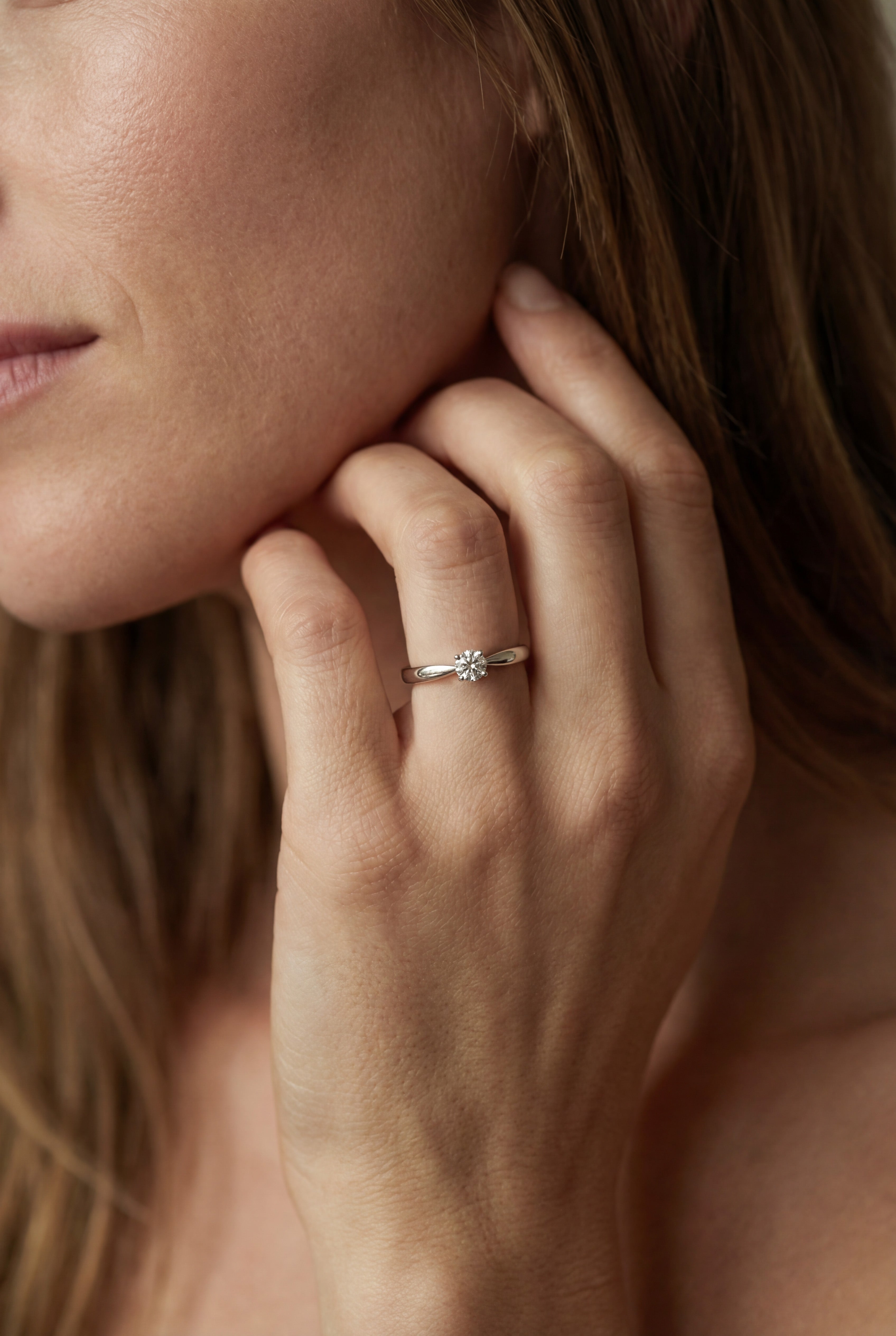 Un símbolo eterno de amor y compromiso. Este anillo solitario de oro blanco 14K luce un deslumbrante diamante natural de 0.32ct, con un hermoso color I y claridad SI1. Su diseño clásico y elegante realza la pureza y el brillo de la piedra, que marcará para siempre su momento especial.