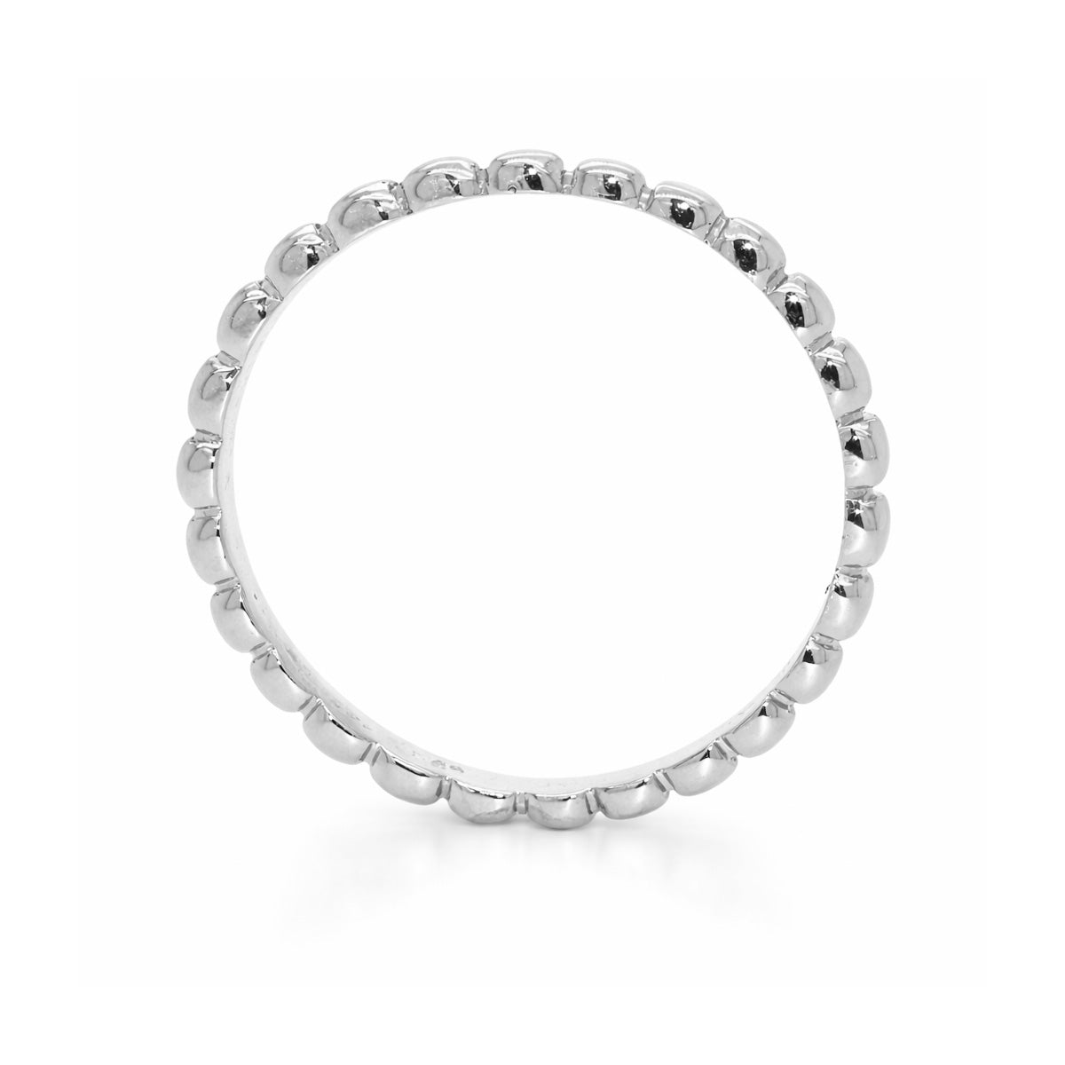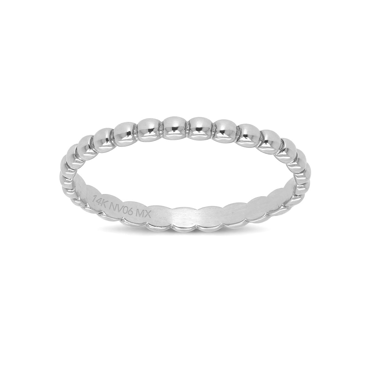Anillo elaborado en oro blanco de 14K con diseño perlée, caracterizado por su delicada textura de microesferas que aporta brillo sutil y un acabado contemporáneo. Su estilo minimalista lo convierte en una pieza versátil, ideal para llevar sola o combinar en stacking con otros anillos para crear composiciones elegantes y actuales.