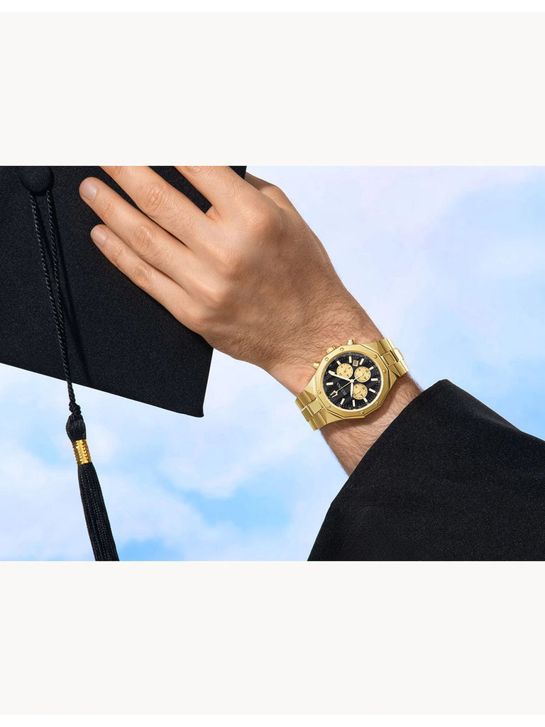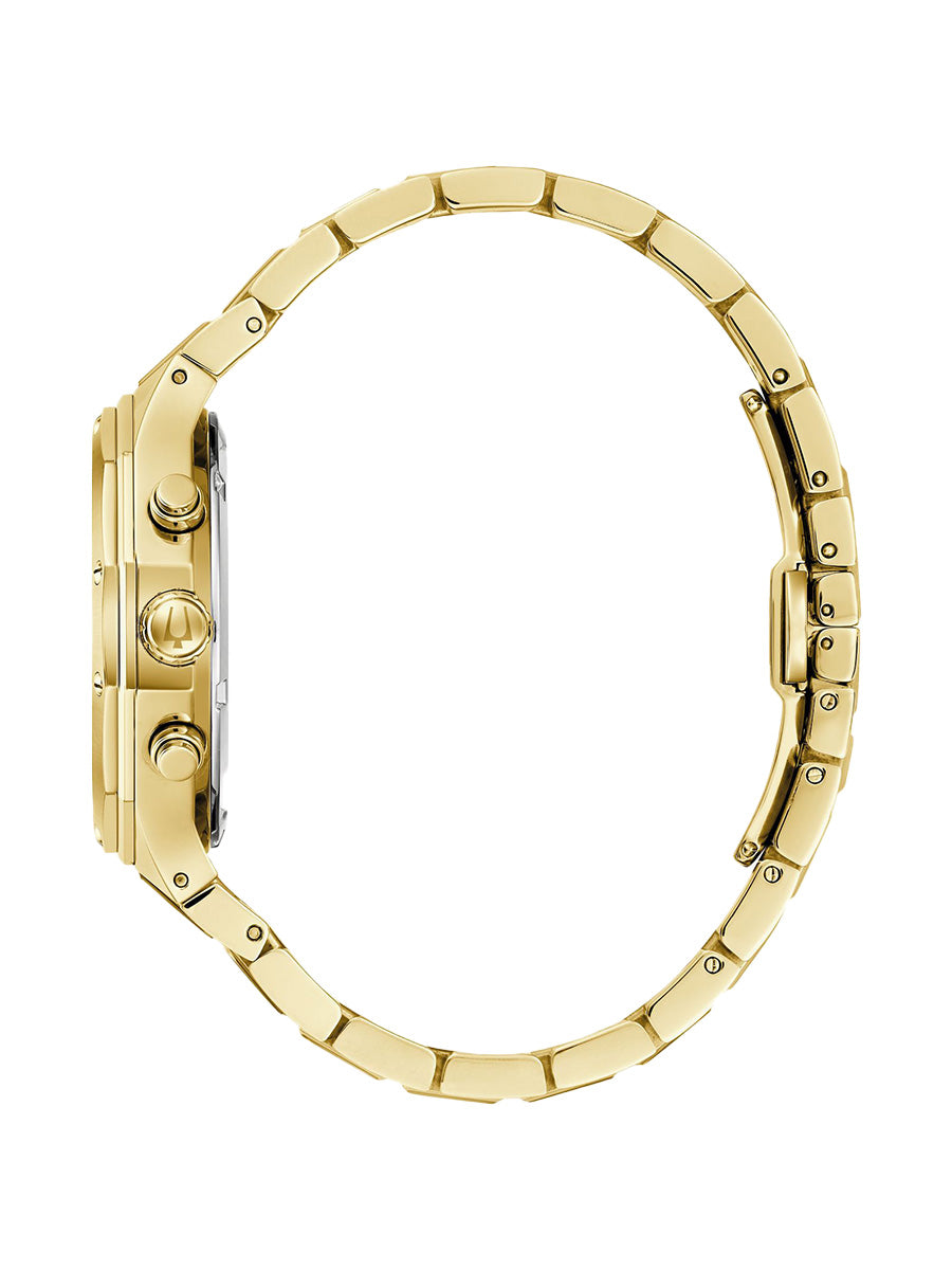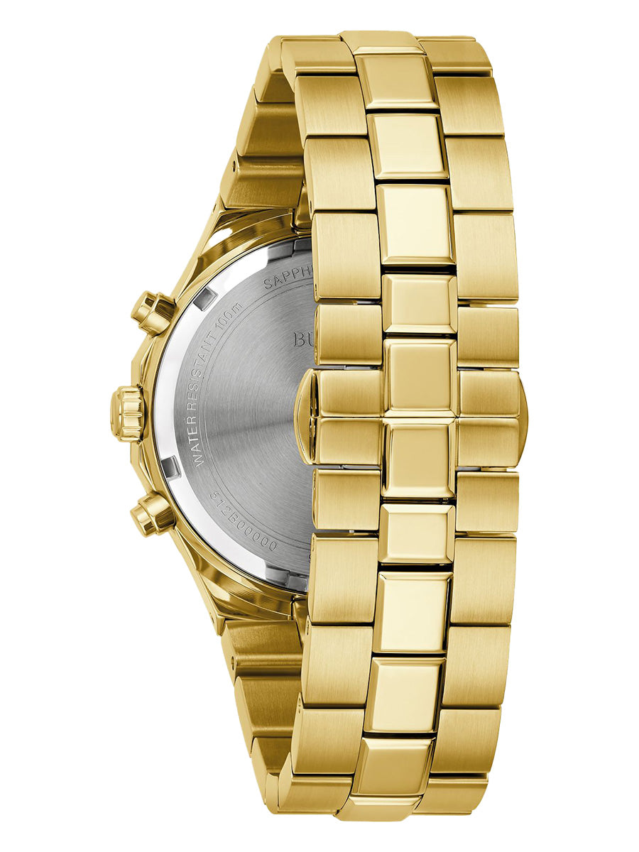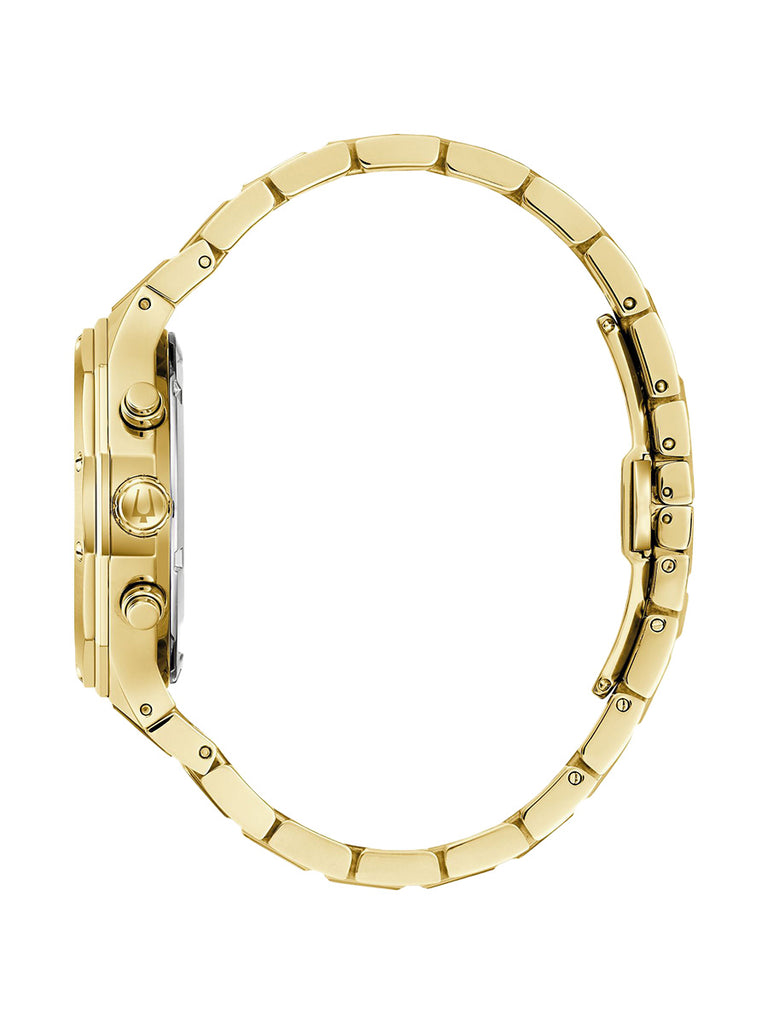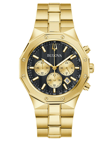 Reloj Bulova para Caballero colección Clásicos Prestige. Movimiento cronógrafo de cuarzo de 6 manecillas, fechador en posición de las 5 Hrs, 3 subcarátulas. Caja poligónica y brazalete de 3 eslabones realizado en acero inoxidable acabado PVD dorado en acabado cepillado,broche desplegable de doble pulsador. Función de taquímetro en carátula interna. Carátula negra texturizada, indicadores y manecillas luminiscentes en dorado. Cristal de zafiro con tratamiento antirreflejante. Resistencia al agua de hasta 100 metros.