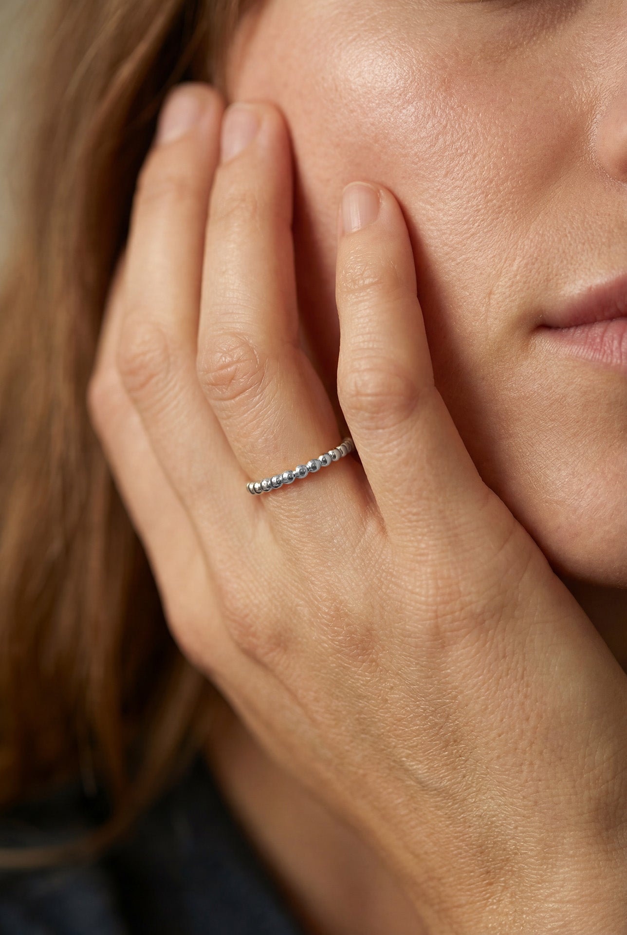 Anillo elaborado en oro blanco de 14K con diseño perlée, caracterizado por su delicada textura de microesferas que aporta brillo sutil y un acabado contemporáneo. Su estilo minimalista lo convierte en una pieza versátil, ideal para llevar sola o combinar en stacking con otros anillos para crear composiciones elegantes y actuales.