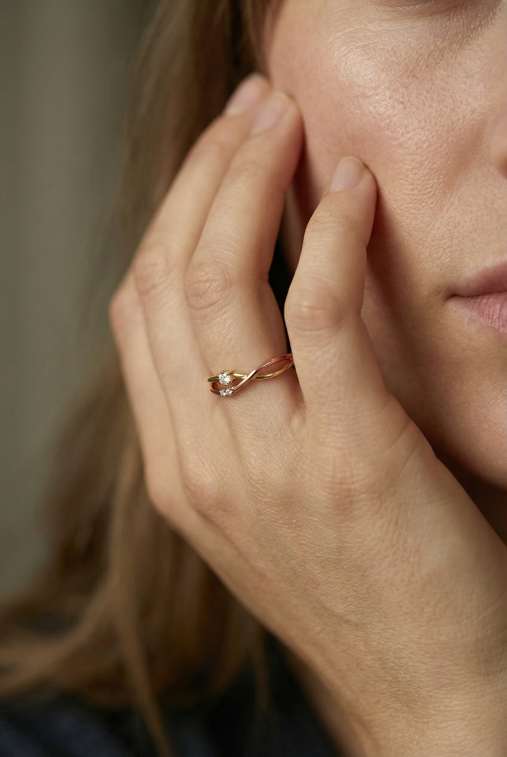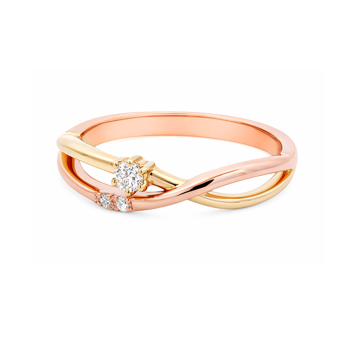 Este anillo split shank combina oro rosa y amarillo de 14K en un diseño ligero que juega con el contraste y el movimiento. Su diamante principal de 0.06 ct se acompaña de dos delicados brillantes que suman 0.02 ct, creando un destello sutil pensado para usarse todos los días.