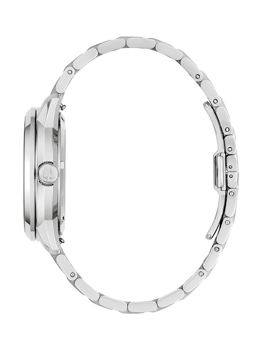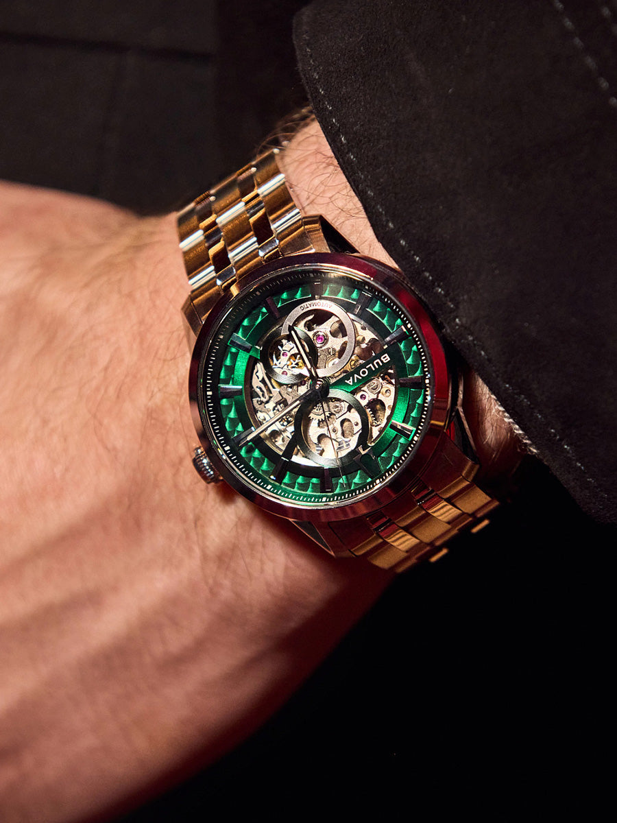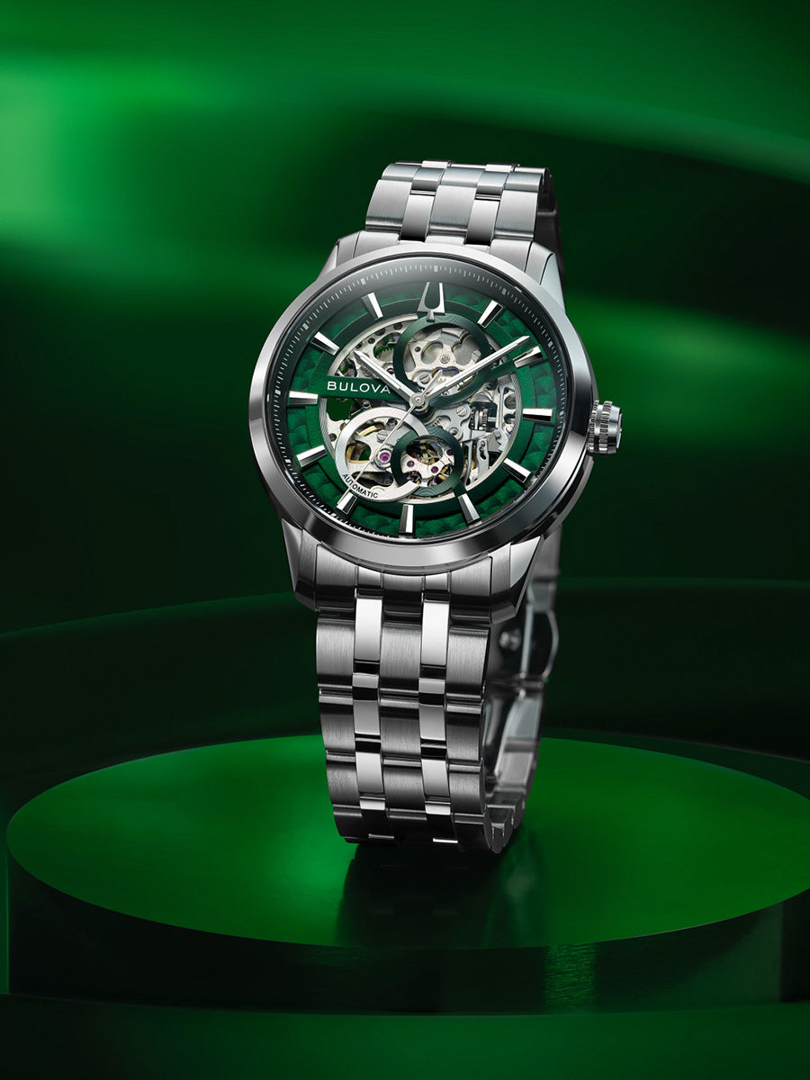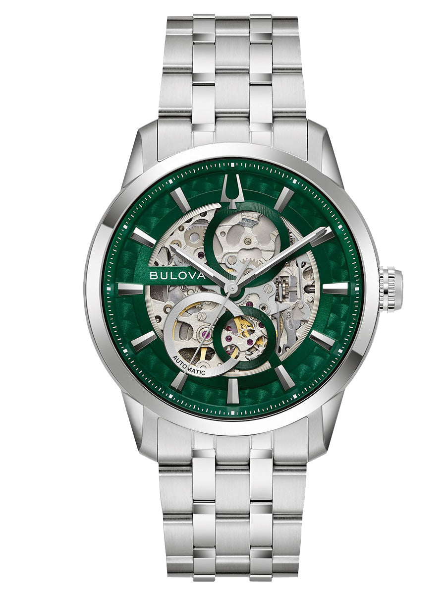 Reloj Bulova para Caballero, colección Sutton. Movimiento mecánico de cuerda automática de 3 manecillas. 42 horas de reserva de marcha. Caja y brazalete realizados en acero inoxidable, broche desplegable de doble pulsador. Carátula esqueletada que permite observar el funcionamiento del reloj en gris y detalle verde intenso en los bordes, indicadores y manecillas luminiscentes en plateado. Cristal de zafiro abombado. Tapa transparente.