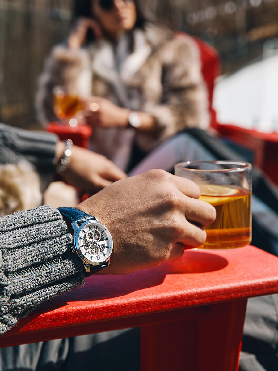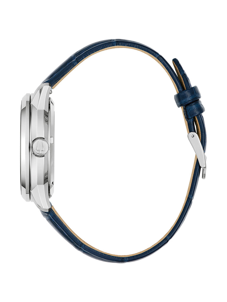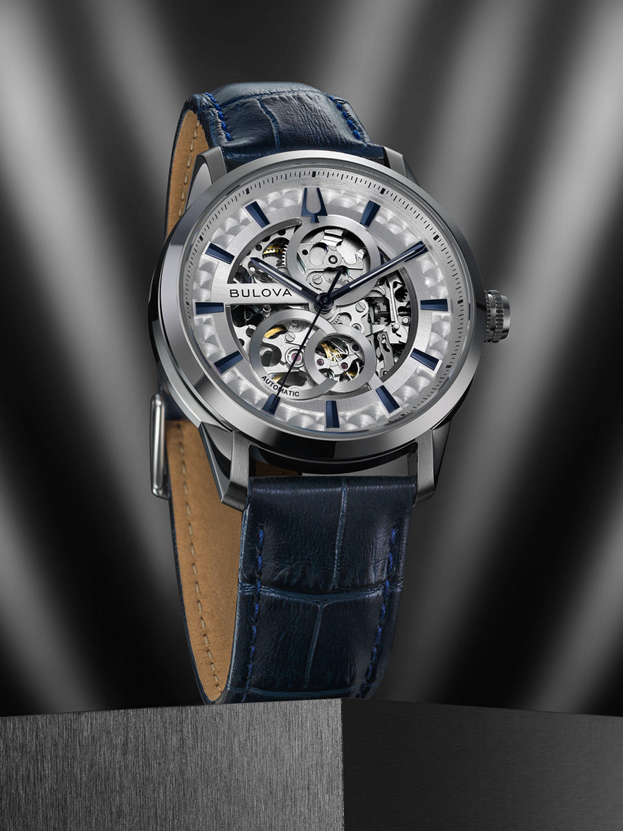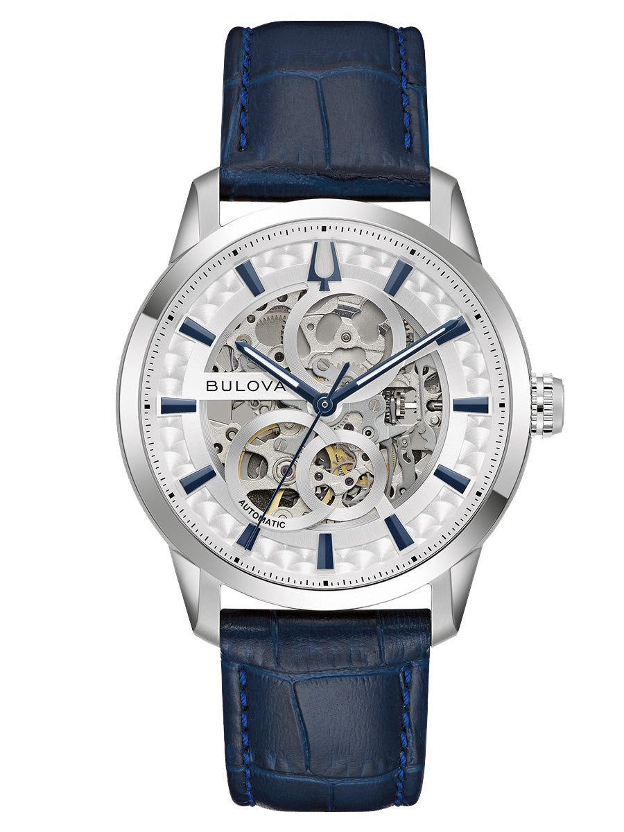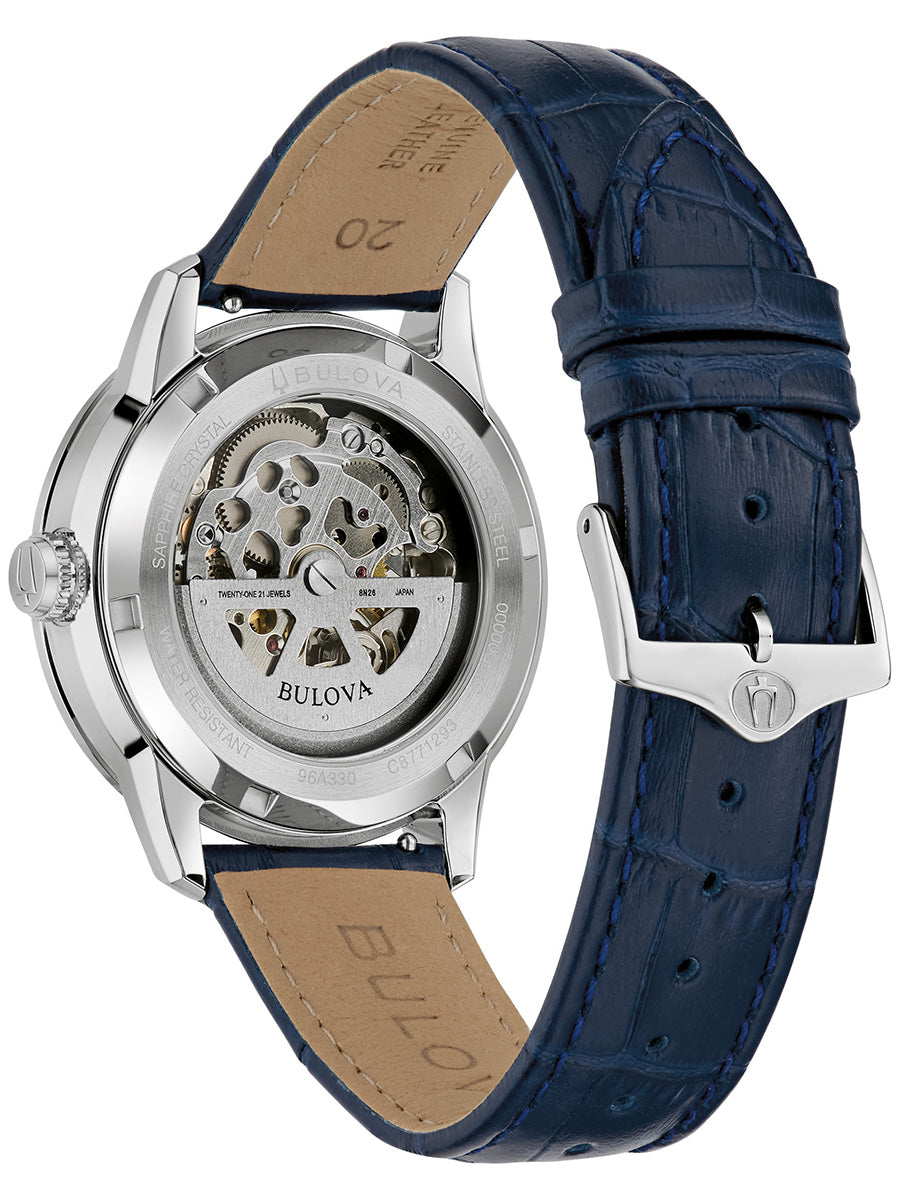 Reloj Bulova para Caballero, colección Sutton. Movimiento mecánico de cuerda automática de 3 manecillas. 42 horas de reserva de marcha. Caja realizada en acero inoxidable. Carátula esqueletada que permite observar el funcionamiento del reloj en gris, indicadores y manecillas luminiscentes en azul. Correa de piel azul marino en acabado tipo cocodrilo, broche desplegable de doble pulsador. Cristal de zafiro abombado. Tapa transparente.