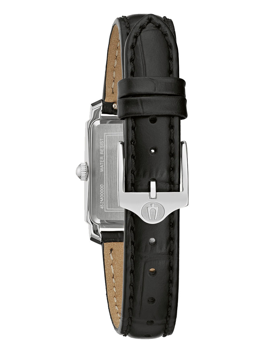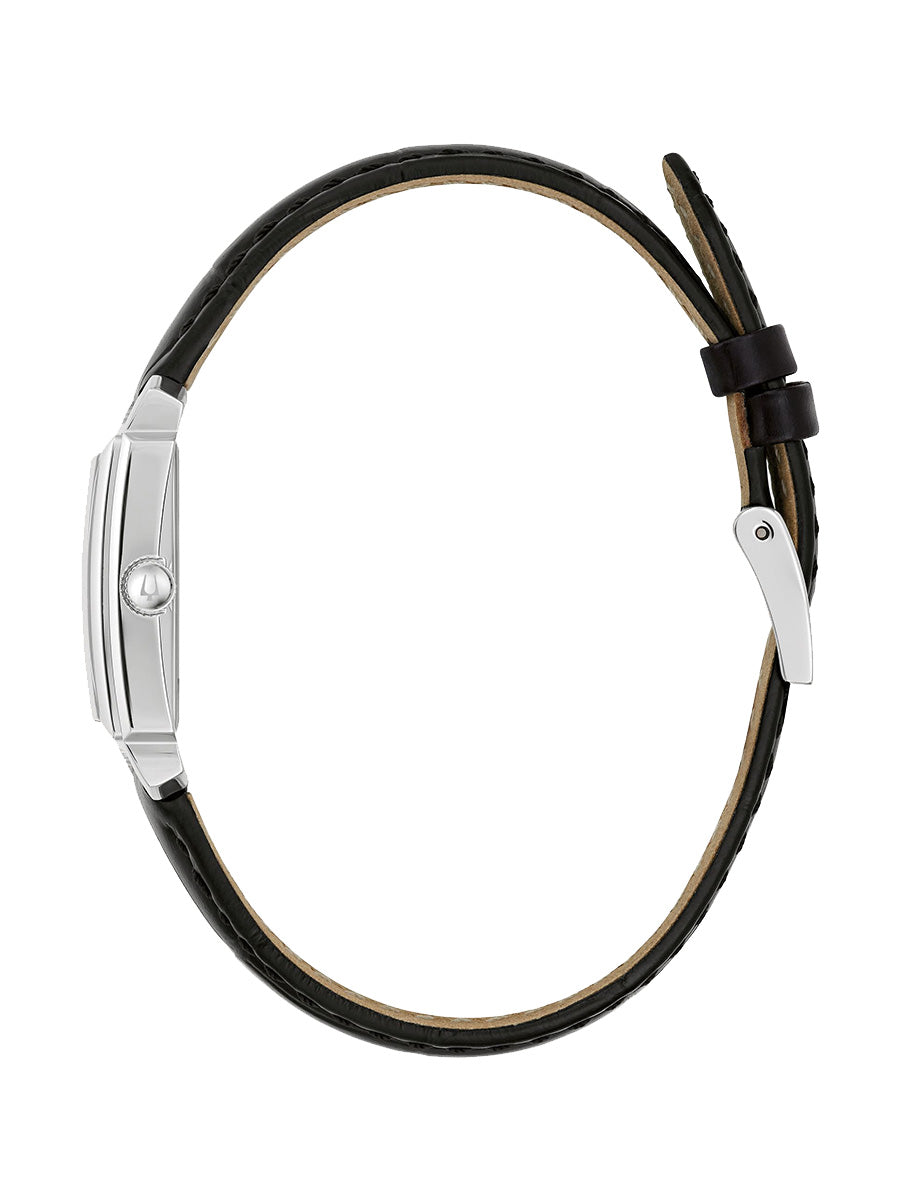 Reloj Bulova para Dama, colección Sutton. Movimiento de cuarzo de 2 manecillas. Caja rectangular realizada en acero inoxidable. Carátula en Madre Perla blanca, indicadores y manecillas en plateado. Correa de piel negra acabado tipo cocodrilo, broche tipo hebilla de 3 piezas. Cristal mineral.