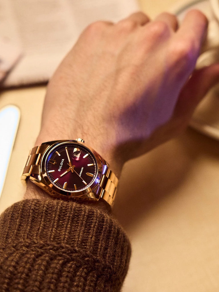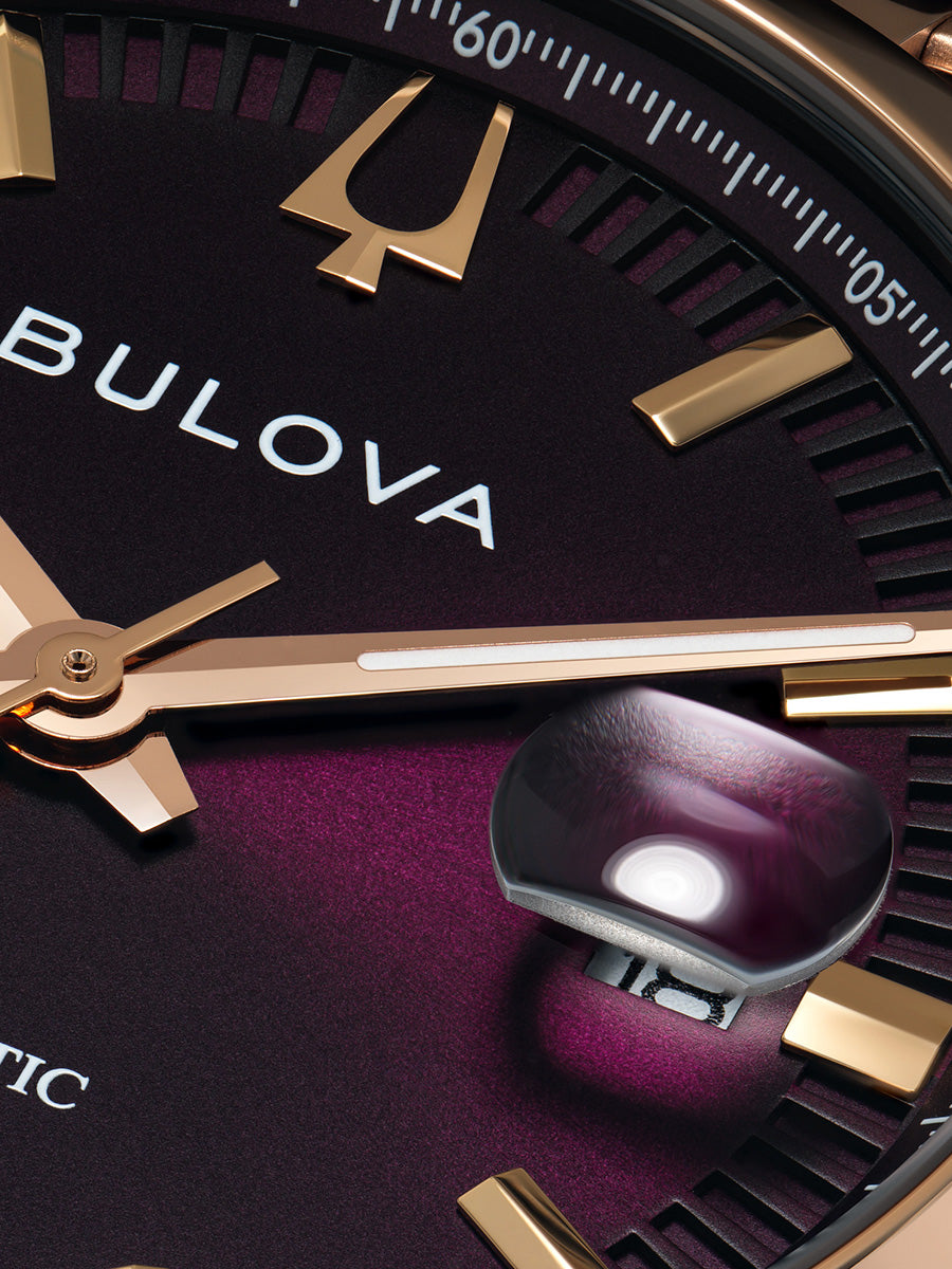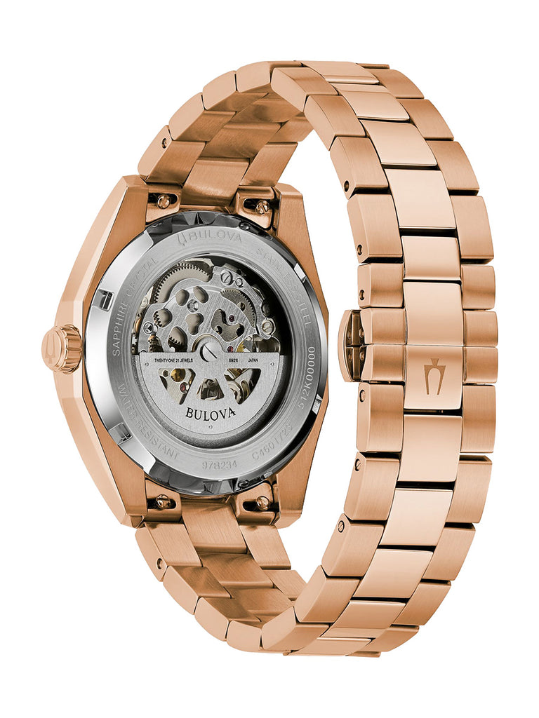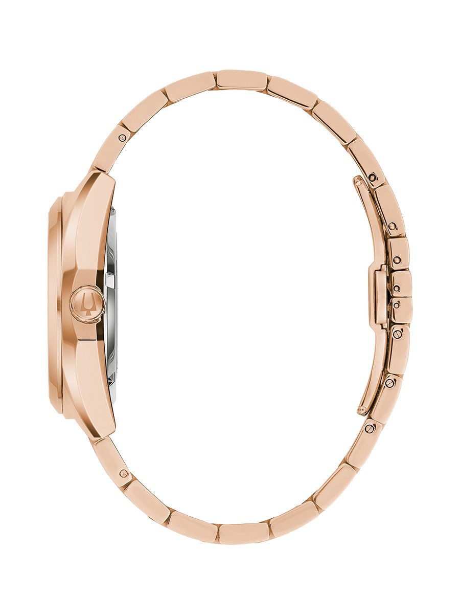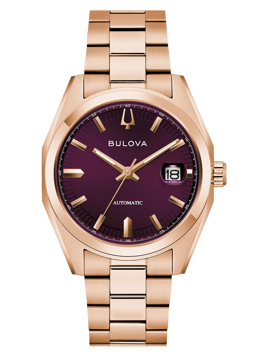 Reloj Bulova para Caballero, colección Surveyor. Movimiento mecánico de cuerda automática de 3 manecillas y fechador en posición de las 3Hrs, con gota de aumento. 42 horas de reserva de marcha. Caja y brazalete realizados en acero inoxidable acabado PVD oro rosa broche desplegable de doble pulsador. Carátula purpura, indicadores y manecillas luminiscentes en oro rosa. Tapa transparente
