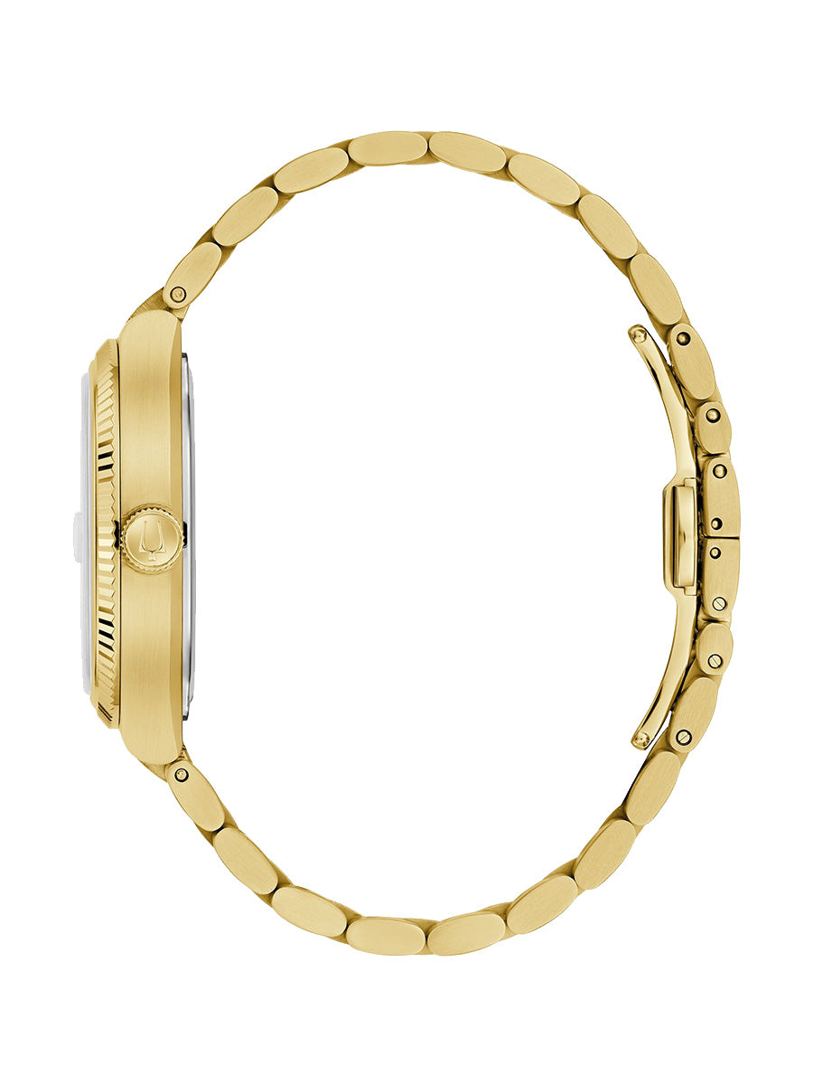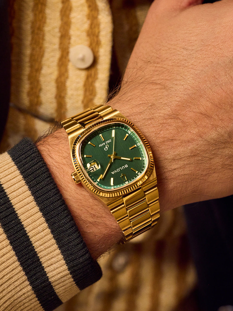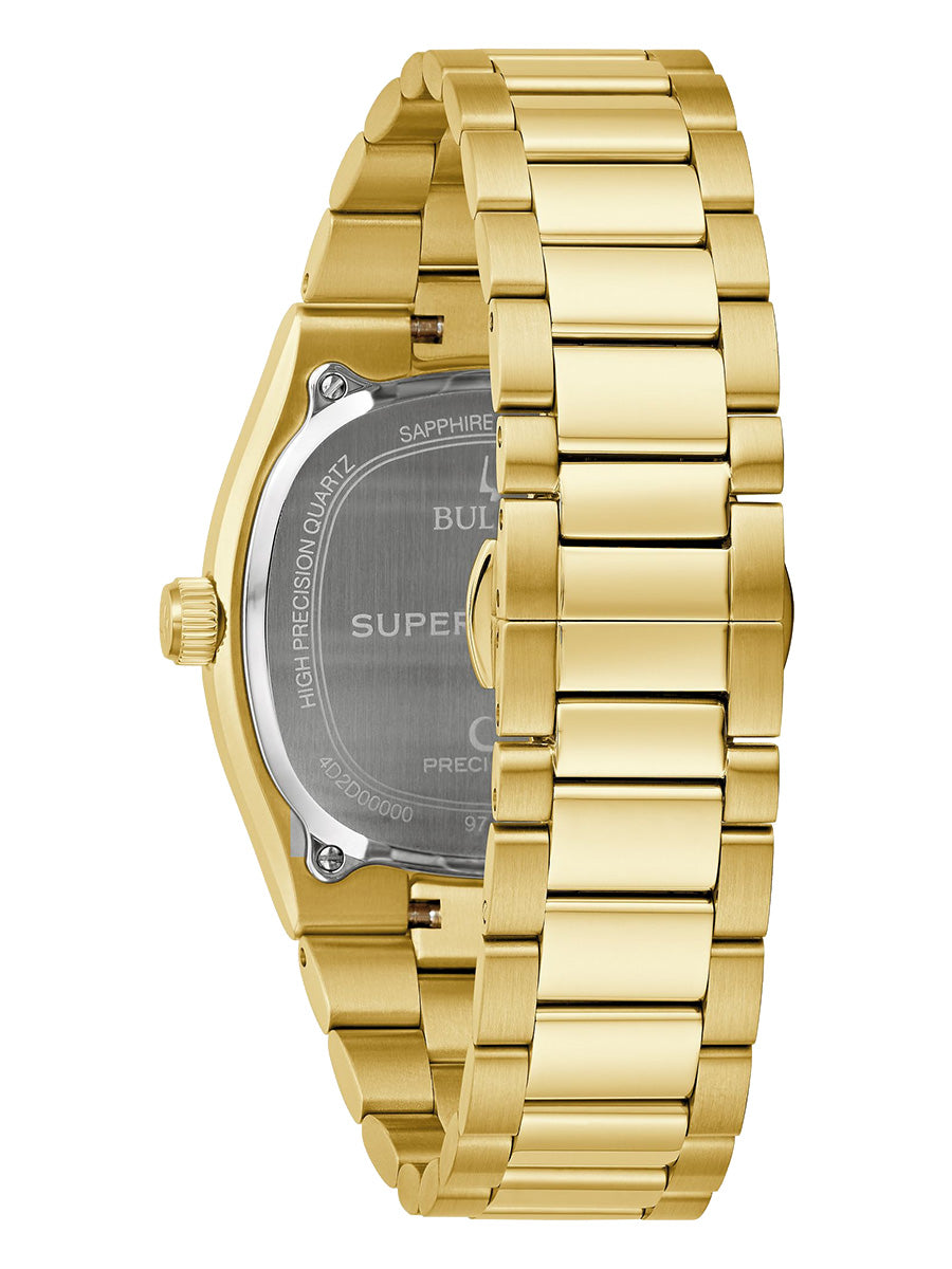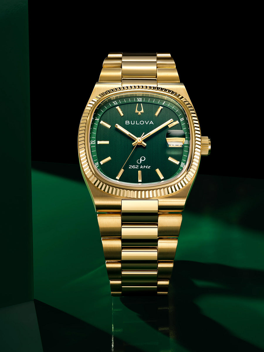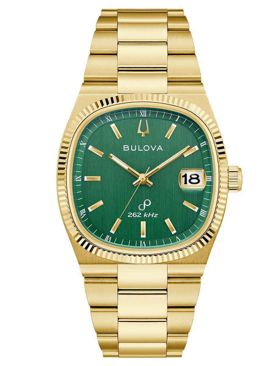 Reloj Bulova colección Archivo Histórico Super Seville para Caballero. Movimiento HPQ con una frecuencia de 262 kHz, tecnología exclusiva de Bulova de 3 manecillas y fechador con gota de aumento. Caja y brazalete realizados en acero inoxidable acabado PVD dorado, broche desplegable de doble pulsador. Elegante bisel tipo moneda que realza la caja de este modelo en dorado, con un cristal de zafiro de borde a borde. Carátula verde en acabado cepillado, indicadores y manecillas luminiscentes en dorado; segundero de movimiento continuo en plateado y fechador en posición de las 3Hrs.