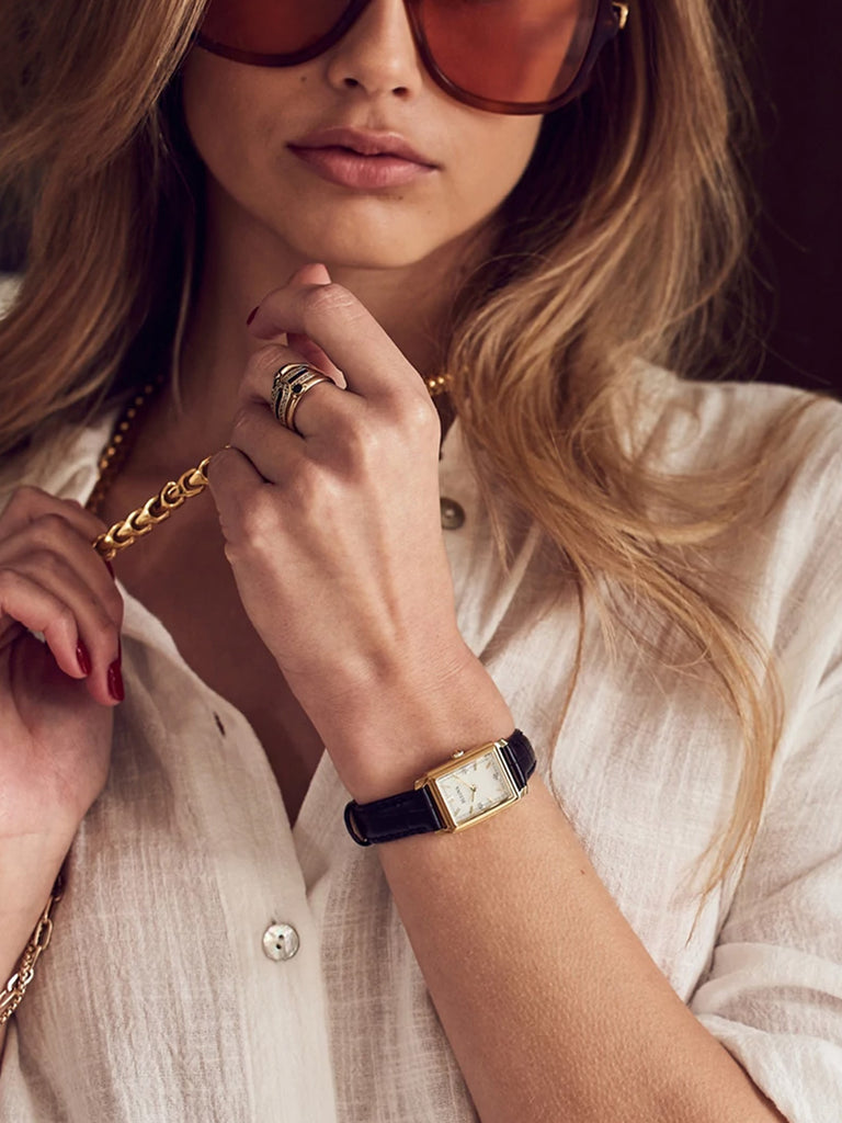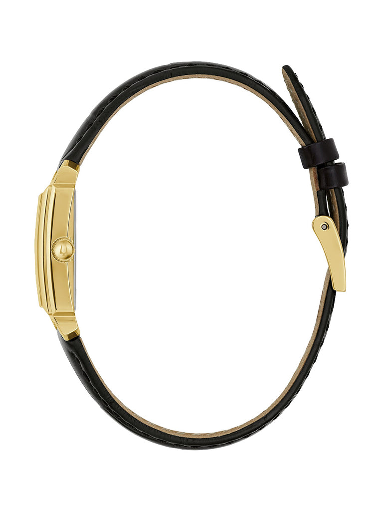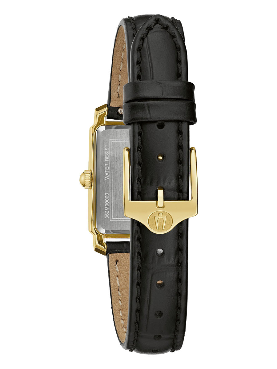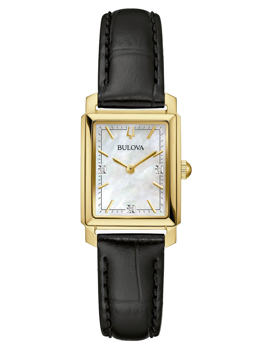 Reloj Bulova colección Sutton para Dama. 3 diamantes montados a mano de forma individual en carátula como indicadores. Movimiento de cuarzo de 2 manecillas. Caja rectangular realizada en acero inoxidable acabado PVD dorado. Carátula de Madre Perla blanca, indicadores y manecillas en dorado. Correa de piel negra, acabado tipo cocodrilo, broche tipo hebilla de 3 piezas. Cristal Mineral.