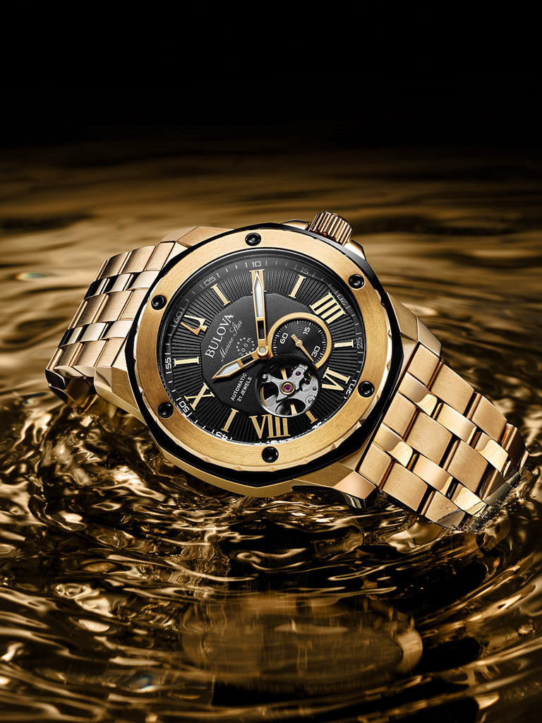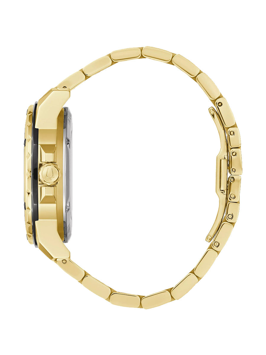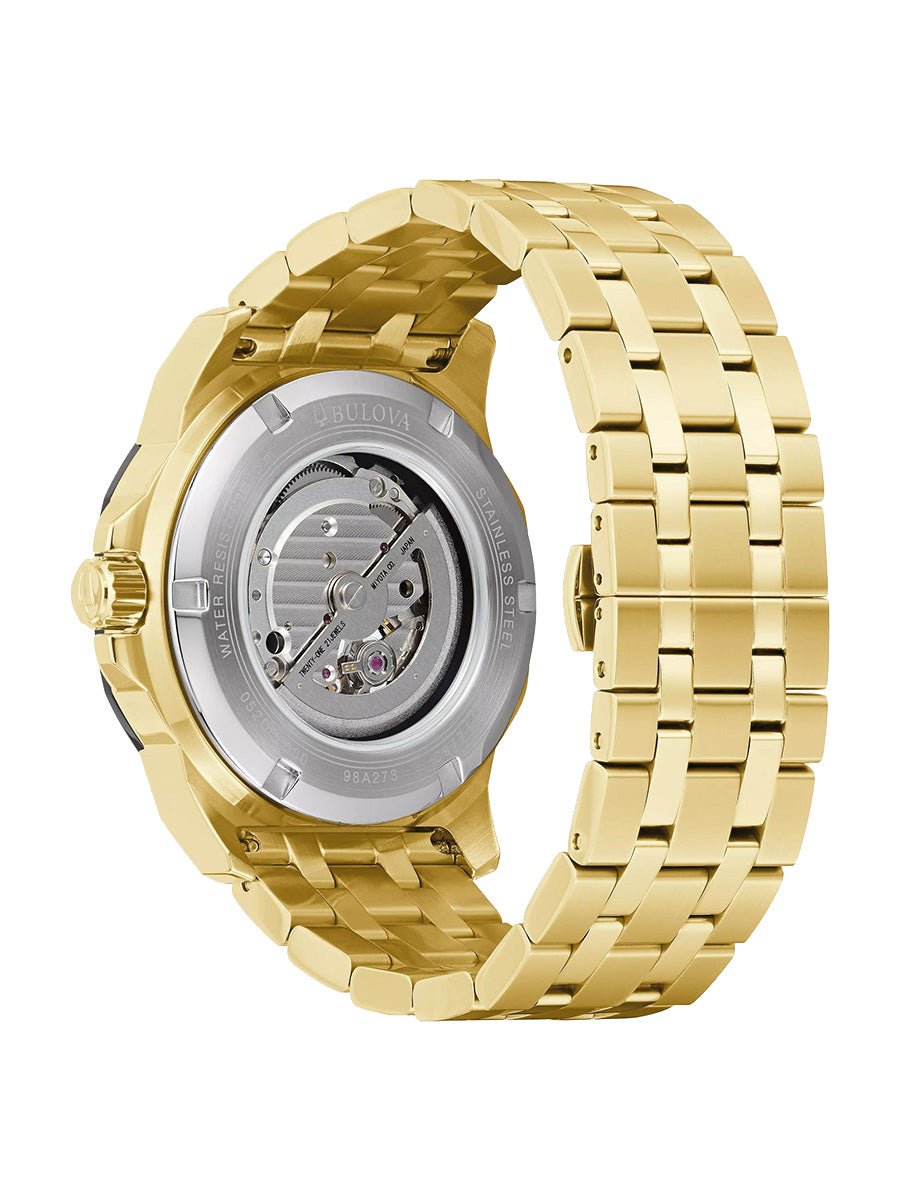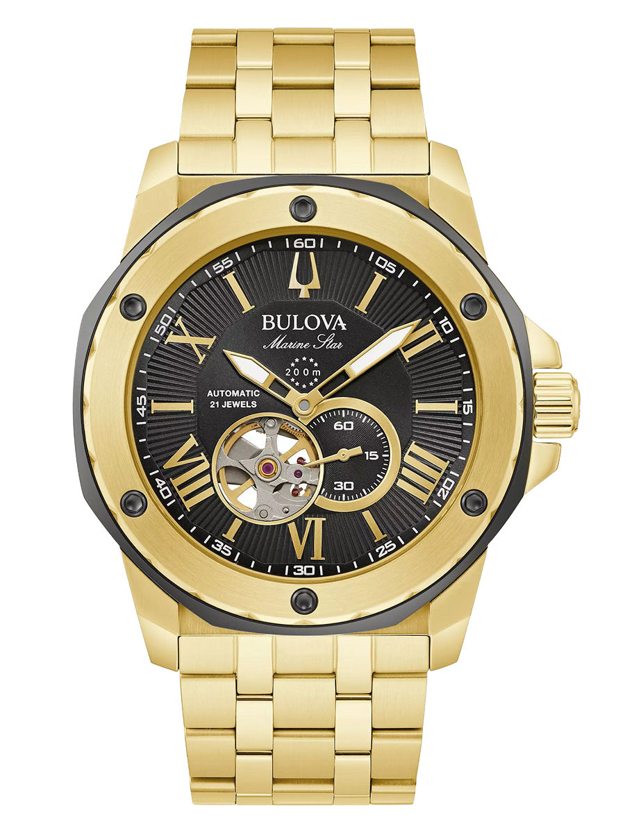 Reloj Bulova colección Marine Star para Caballero. Movimiento mecánico de cuerda automática de 3 manecillas. Reserva de marcha de 42 horas. Caja y brazalete realizados en acero inoxidable acabado PVD dorado. Carátula texturizada en negro, con apertura que permite ver el mecanismo en movimiento, indicadores y manecillas luminiscentes en dorado. Tapa trasera transparente. Cristal mineral. Resistencia al agua de hasta 200 metros.