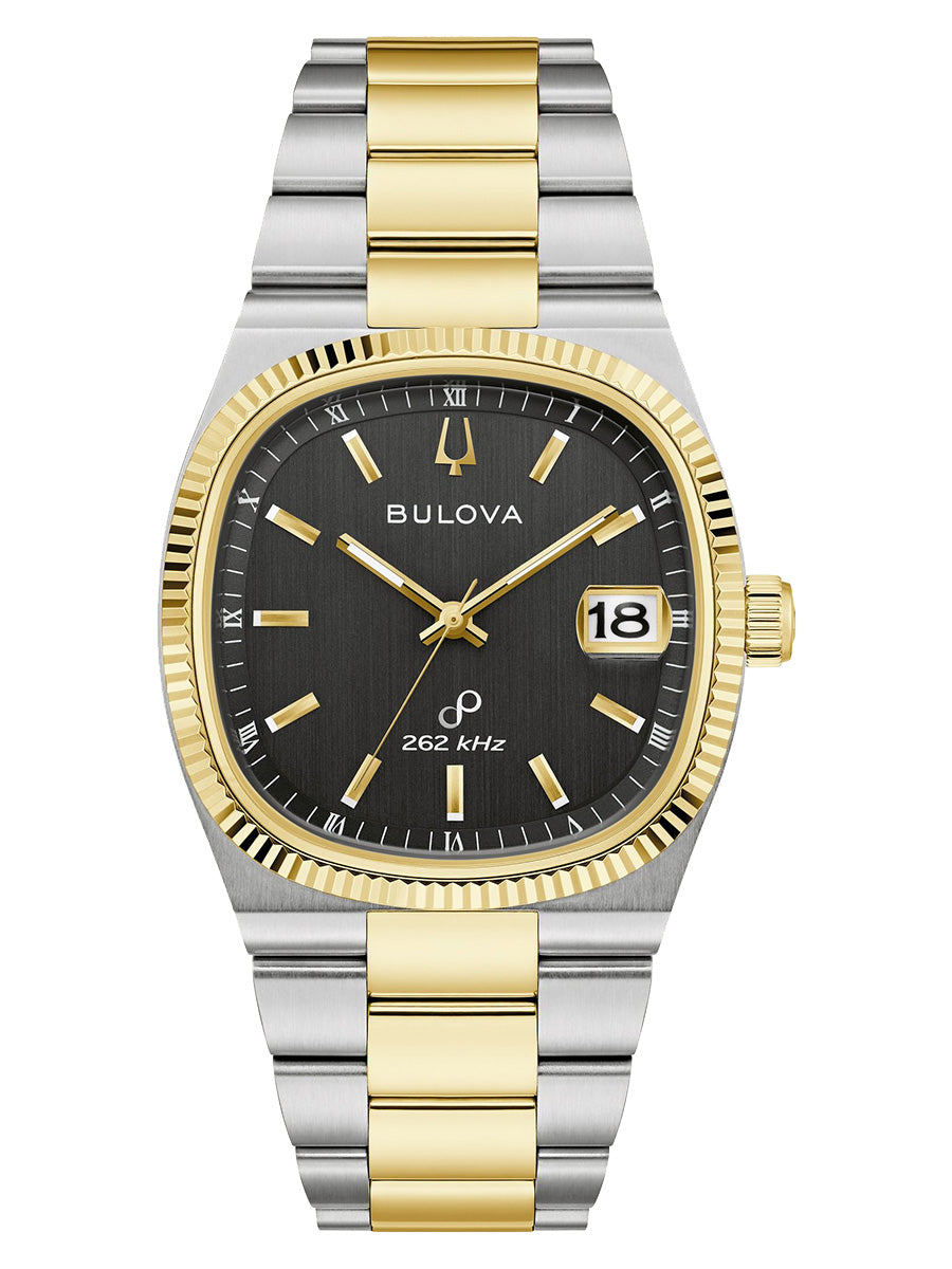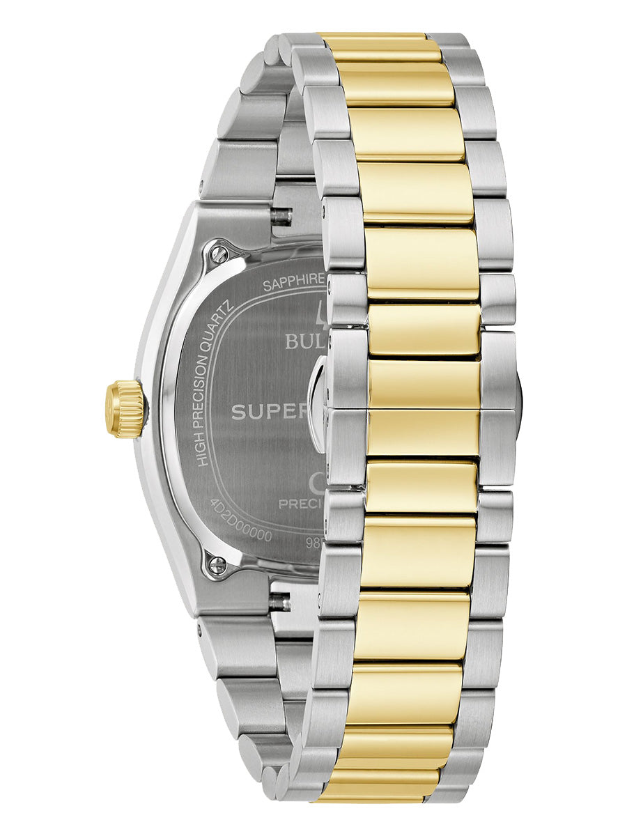 Reloj Bulova colección Archivo Histórico Super Seville para Caballero. Movimiento HPQ con una frecuencia de 262 kHz, tecnología exclusiva de Bulova de 3 manecillas y fechador con gota de aumento. Caja y brazalete realizados en acero inoxidable dos tonos acero/dorado, broche desplegable de doble pulsador. Elegante bisel tipo moneda que realza la caja de este modelo en dorado, con un cristal de zafiro de borde a borde. Carátula negra en acabado cepillado, indicadores y manecillas luminiscentes en dorado; segundero de movimiento continuo en plateado y fechador en posición de las 3Hrs.