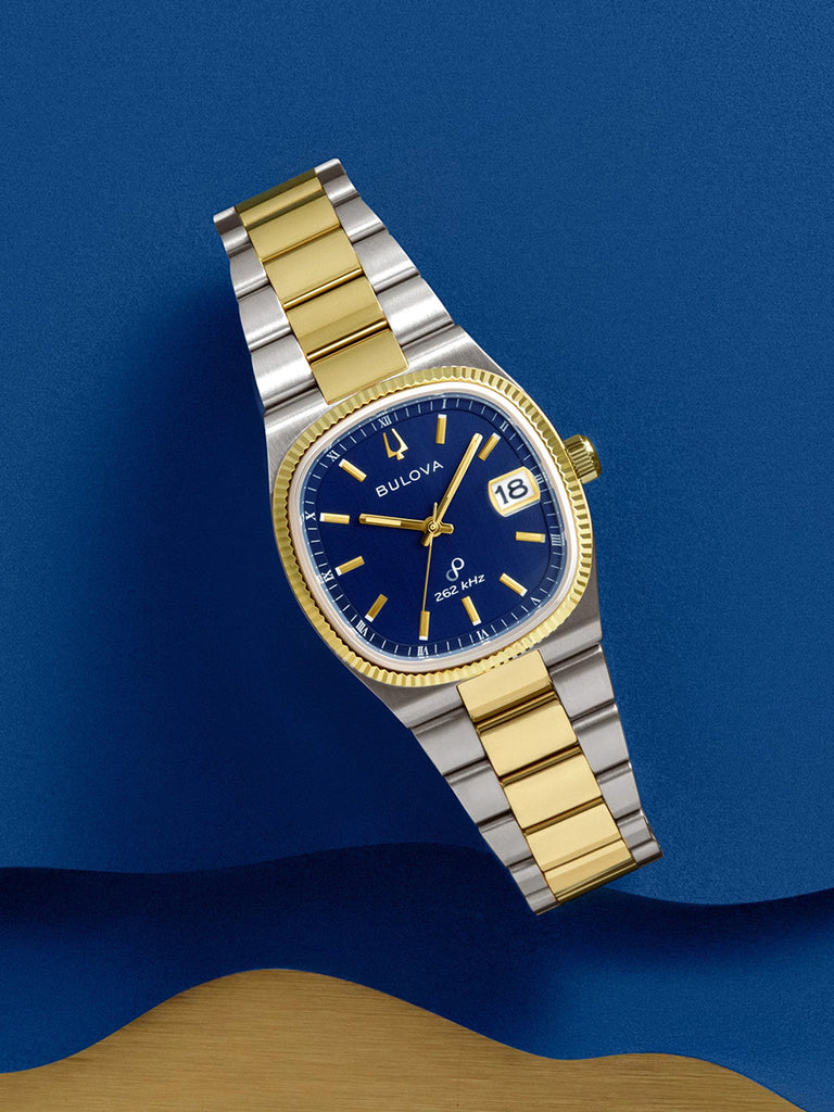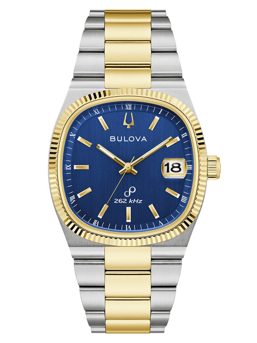Reloj Bulova colección Archivo Histórico Super Seville para Caballero. Movimiento HPQ con una frecuencia de 262 kHz, tecnología exclusiva de Bulova de 3 manecillas y fechador con gota de aumento. Caja y brazalete realizados en acero inoxidable dos tonos acero/dorado, broche desplegable de doble pulsador. Elegante bisel tipo moneda que realza la caja de este modelo en dorado, con un cristal de zafiro de borde a borde. Carátula azul en acabado cepillado, indicadores y manecillas luminiscentes en dorado; segundero de movimiento continuo en plateado y fechador en posición de las 3Hrs.
