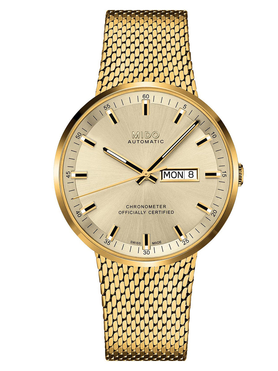 El reloj suizo Commander Icône rinde homenaje a uno de los modelos más icónicos de MIDO. Su diseño neo-vintage adopta la mayoría de los códigos responsables del éxito del Commander: líneas extremadamente puras, el máximo espacio otorgado a la soberbia carátula satinada con rayos de sol y el brazalete de malla milanesa. Está equipado con el Calibre 80 Chronometer Silicon, un movimiento automático de cronómetro certificado por COSC con una espiral de silicio para una precisión superior y que ofrece hasta 80 horas de reserva de marcha.